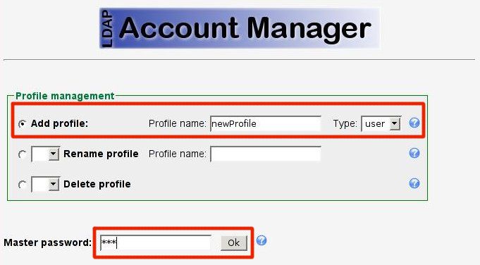 Specify a name for the new profile and enter you master configuration password (default is "lam") to save the profile.