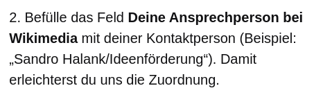 ändern: „2. Befülle das Feld Deine Ansprechperson bei Wikimedia mit deiner Kontaktperson (Beispiel: „Sandro Halank/Ideenförderung“). Damit erleichterst du uns die Zuordnung.“ -> „2. Befülle das Feld Deine Ansprechperson bei Wikimedia mit deiner Kontaktperson (die Person, mit der du im Team Communitys und Engagement Kontakt hattest). Damit erleichterst du uns die Zuordnung.“